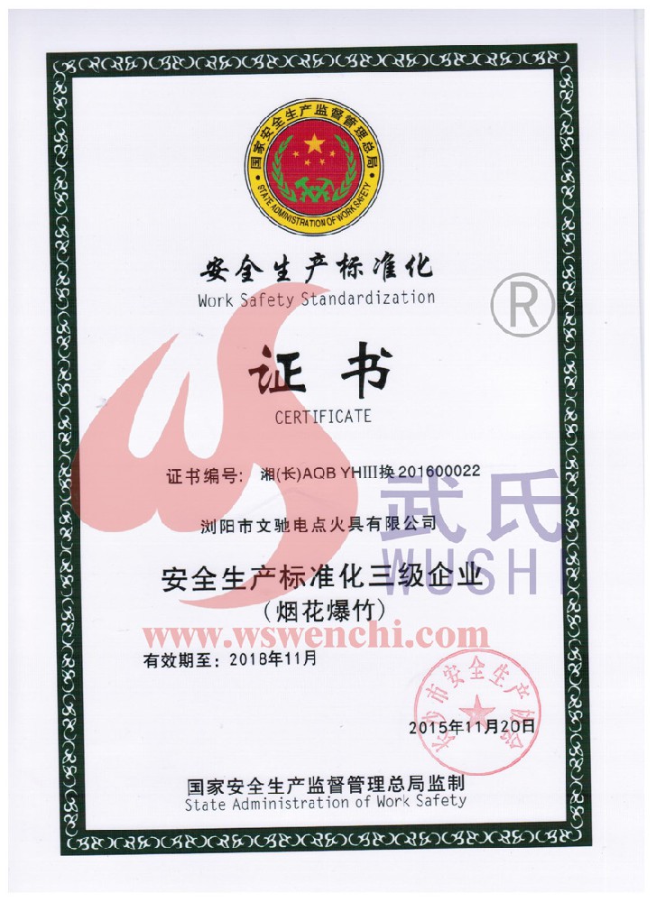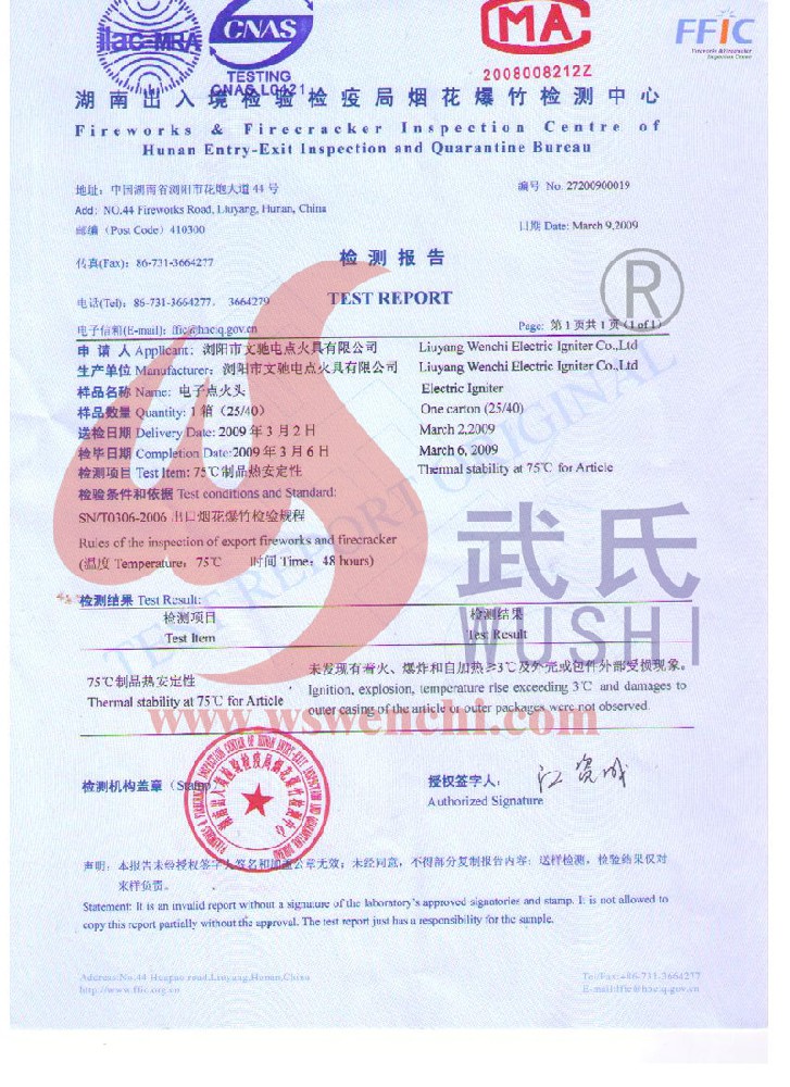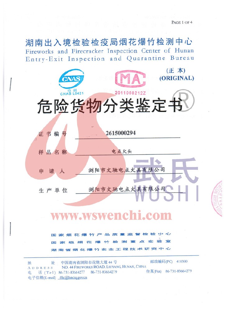 瀏陽市文馳電點火具有限公司(原培文電子點火器材廠),創(chuàng)建于1998年,是一家專業(yè)從事研制銷售電子點火產品的民營科技企業(yè),是我國第1枚煙花用電點火頭生產者,是《煙花爆竹電點火頭國標》牽頭起草單位。公司位于中國“煙花之鄉”湖南省瀏陽市,地理位置優(yōu)越,交通便利。    我公司研制的對象是用電能引燃火藥、做機械功等預定功能的一次性使用的元件或裝置,包括電點火頭(英文名ElectricMatch or Electric Igniter,中文俗稱“電火柴”或“電發(fā)火頭”)、電點火管和延期電點火管;我們估且在以后的產品技術欄中將我們研究的產品統稱為電點火具,將電點火器看成是用于提供和控制供給電點火元件點火的電能器材;我們研究的電點火橋路有橋絲式、無橋絲···